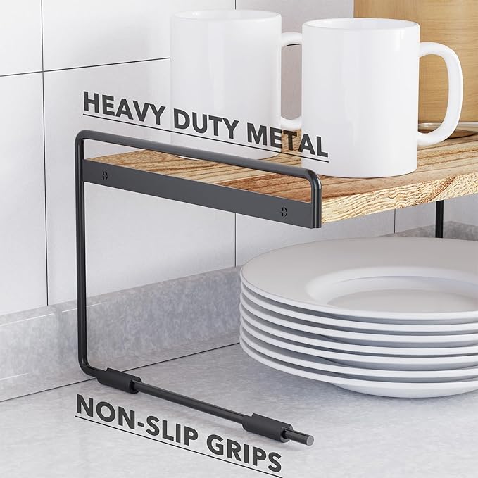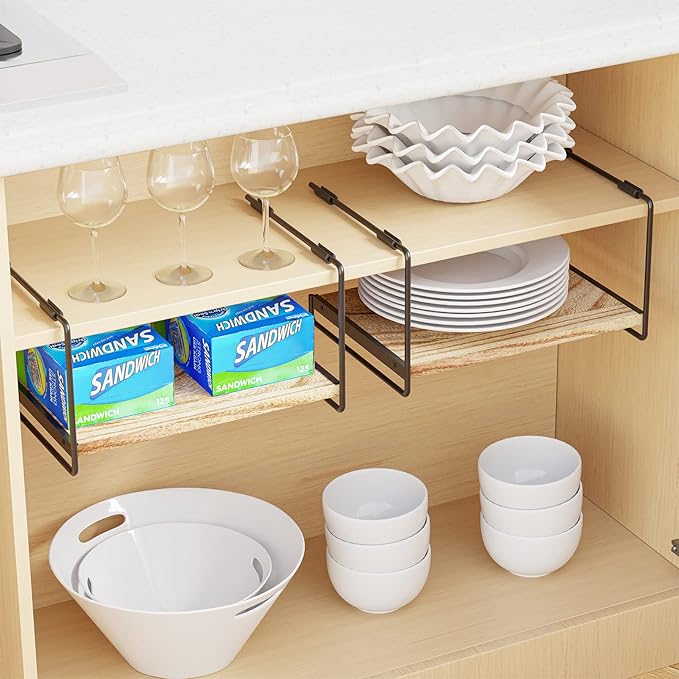 - 2-IN-1 SHELF ORGANIZER - Maximize cabinet storage space. This rack can both be riser shelf and under storage shelf. Riser shelf to storage more cups and plates; Under storage shelf to keep supples and essentials neatly stored in the cabinet.